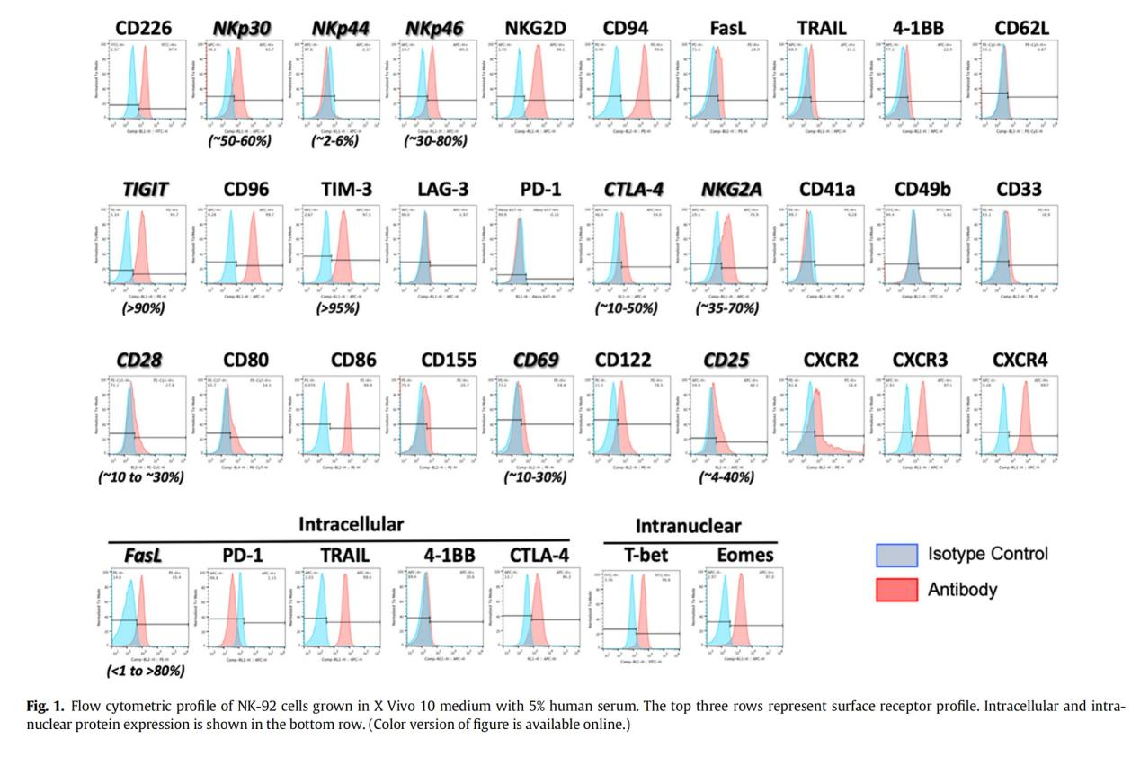 由于含有動(dòng)物成分的培養(yǎng)基不適合任何臨床開(kāi)發(fā),因此在隨后的幾年里,人們努力尋找一種無(wú)動(dòng)物成分的培養(yǎng)基,以維持NK-92細(xì)胞的最佳生長(zhǎng)/擴(kuò)增和功能。研究發(fā)現(xiàn),用5%人血清補(bǔ)充的X-Vivo 10培養(yǎng)基(Lonza Bioscience, Basel, Switzerland)能夠滿足這些要求。值得注意的是,細(xì)胞所處的培養(yǎng)基會(huì)影響NK-92細(xì)胞表面分子的表達(dá)及其功能。由于美國(guó)ATCC在其網(wǎng)站上推薦使用含有馬血清和小牛血清的原始培養(yǎng)基,許多研究人員仍在使用這種特定的培養(yǎng)基。培養(yǎng)基的影響體現(xiàn)在NK-92細(xì)胞表面分子表達(dá)的一個(gè)例子是NKp44,只有當(dāng)NK-92細(xì)胞在含有動(dòng)物血清的培養(yǎng)基中培養(yǎng)時(shí)才會(huì)表達(dá)該分子(Boissel, L. (2016))。圖1總結(jié)了在用5%人血清的X-Vivo 10培養(yǎng)時(shí)臨床級(jí)NK-92的表面抗原譜。