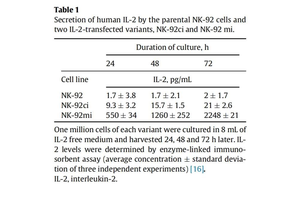 由于原始的NK-92細(xì)胞系需要在培養(yǎng)基中存在白介素(IL)-2(或IL-15)來(lái)支持其持續(xù)生長(zhǎng)和擴(kuò)增,因此通過(guò)將IL-2基因轉(zhuǎn)染到親本細(xì)胞中,產(chǎn)生了兩種不依賴IL-2的NK-92變體[16]。NK-92ci細(xì)胞系是以用于生成該變體的pCEP4-LTR質(zhì)粒載體命名的,而NK-92mi細(xì)胞系是以MFG載體構(gòu)建物命名的。這兩種構(gòu)建物都是通過(guò)顆粒介導(dǎo)基因轉(zhuǎn)移(Bio-Rads“基因槍”)的方法轉(zhuǎn)染到親本細(xì)胞中的,這種方法通常具有較低的轉(zhuǎn)染效率。然而,由于轉(zhuǎn)染后的細(xì)胞是在缺乏IL-2的培養(yǎng)基中生長(zhǎng)的,因此只有那些成功轉(zhuǎn)染并表達(dá)IL-2基因的少數(shù)細(xì)胞能夠生長(zhǎng)和擴(kuò)增。所選的NK-92ci和NK-92mi變體能夠產(chǎn)生足夠的IL-2來(lái)維持自身的生長(zhǎng)、擴(kuò)增和細(xì)胞毒性活性[16](表1)。值得注意的是,與NK-92ci細(xì)胞相比,NK-92mi細(xì)胞產(chǎn)生和分泌的IL-2濃度顯著更高。