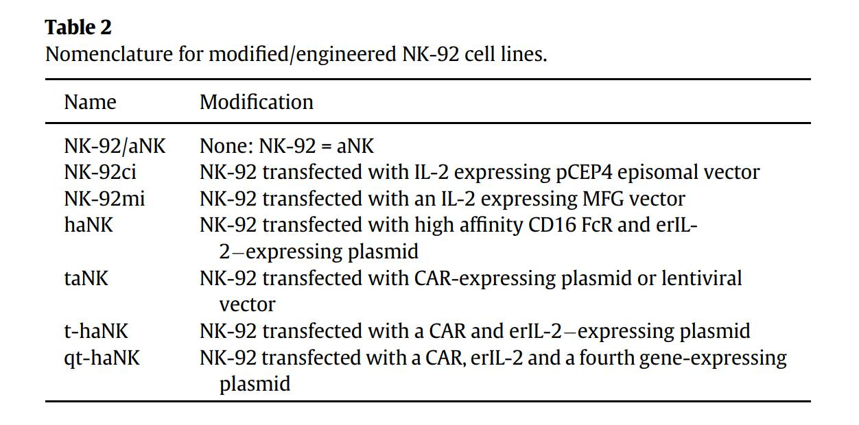NK-92細(xì)胞的特性促使產(chǎn)生了表達(dá)CAR的變體。表2列出了NK-92細(xì)胞的變體,包括NK-92ci、NK-92mi、haNK、taNK、t-haNK和qt-haNK。關(guān)于CAR工程化NK-92細(xì)胞的許多研究已在綜述論文中進(jìn)行了總結(jié)。研究人員使用第一代和第二代CAR構(gòu)建體,這些構(gòu)建體通常通過(guò)慢病毒或逆轉(zhuǎn)錄病毒載體傳遞。盡管幾項(xiàng)研究證實(shí)了CAR修飾的NK-92的療效,但I(xiàn)mmunityBio公司(現(xiàn)持有NK-92變體的全球權(quán)利)使用基于質(zhì)粒的CAR基因構(gòu)建體,并通過(guò)簡(jiǎn)單的電穿孔轉(zhuǎn)染來(lái)產(chǎn)生目前用于臨床研究的NK-92變體。
