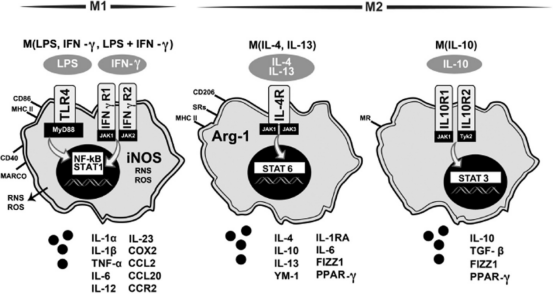 在經(jīng)典的 M1 狀態(tài)下,暴露于 LPS 和/或 IFN-γ 會(huì)分別刺激 TLR4 或 IFN-γ 受體 1 與 2,從而激活轉(zhuǎn)錄因子 NF-κB 和 STAT1,并上調(diào) CD86 和 MHC-II 的表達(dá)。iNOS 的增加會(huì)產(chǎn)生大量活性氮(RNS),并釋放促炎細(xì)胞因子,如 IL-1α、IL-1β、TNF-α、IL-6、IL-12、IL-23,以及趨化因子 CCL2、CCL20,還有受體 CCR2、具有膠原結(jié)構(gòu)的巨噬細(xì)胞受體(MARCO)和 COX2。