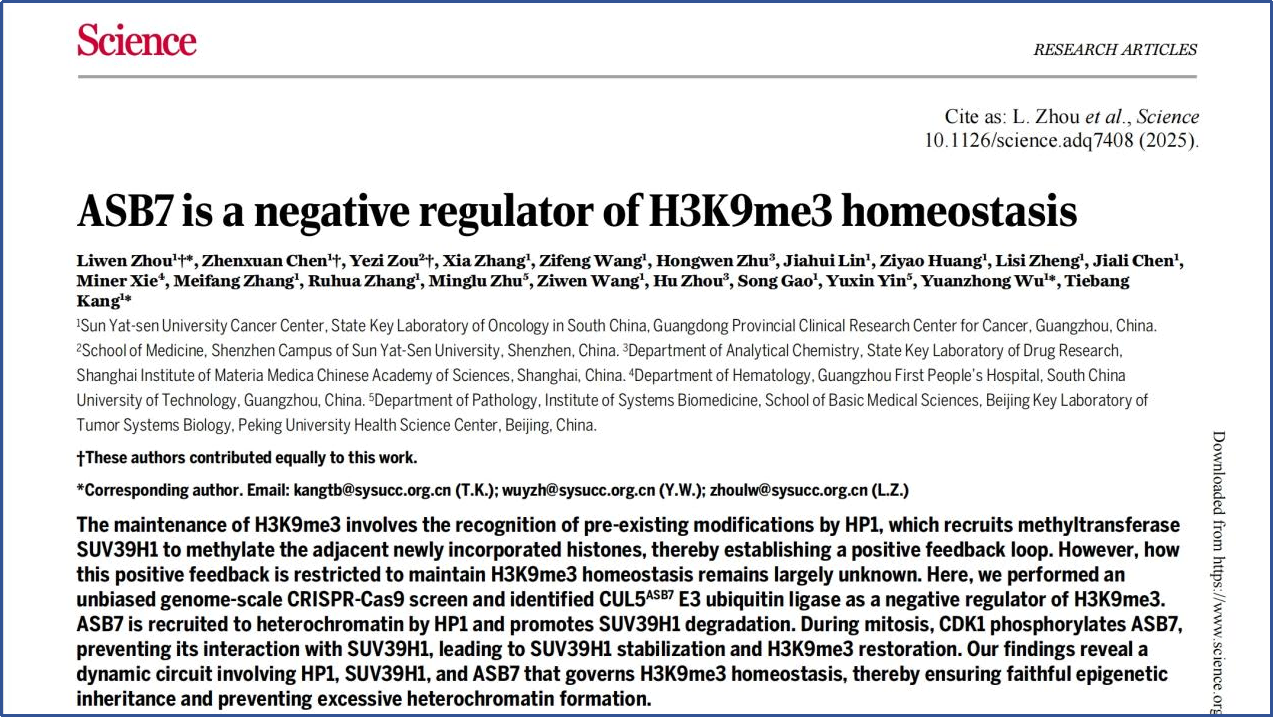 研究團隊通過全基因組范圍的CRISPR-Cas9遺傳學篩選,發(fā)現(xiàn)E3泛素連接酶ASB7是H3K9me3的核心負調(diào)控因子。在調(diào)控機制上,H3K9me3的閱讀器HP1可招募ASB7至異染色質(zhì)區(qū)域降解SUV39H1,這一過程受到細胞周期激酶CDK1-Cyclin B1嚴密控制,進入有絲分裂M期后,CDK1磷酸化ASB7并阻斷其對SUV39H1的泛素化降解,保障了H3K9me3在隨后細胞周期中的重建。該研究表明,在哺乳動物體細胞(含腫瘤細胞)中,“讀-寫-降解”平衡,而非經(jīng)典的“讀-寫-擦除”平衡,可能是H3K9me3維持表觀遺傳穩(wěn)態(tài)的基本機制。