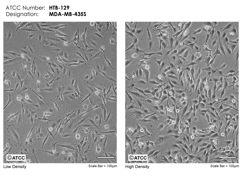 MDA-MB-435S是一種紡錘形的細胞,1976年由其親本(MDA-MB-435)中篩選得到。MDA-MB-435是從一名31歲的轉(zhuǎn)移性乳腺導(dǎo)管腺癌女性患者胸水中分離得到的。但近來證明MDA-MB-435細胞被M14黑色素瘤細胞污染