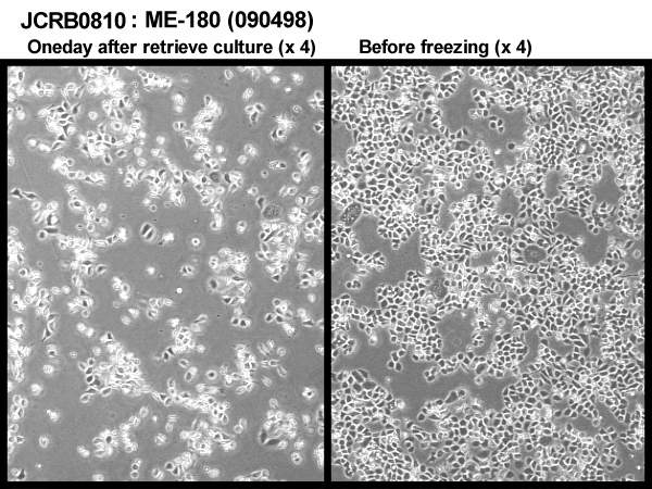 這株細(xì)胞來源于一個(gè)細(xì)胞集落不規(guī)則沒有顯著角質(zhì)化的侵染性鱗狀細(xì)胞癌。單層培養(yǎng)的細(xì)胞間可以觀察到帶狀連接,也注意到有細(xì)胞質(zhì)張力絲。1970年發(fā)現(xiàn)支原體污染并去除。腫瘤壞死因子(TNF)α抑制ME-180的生長。這株細(xì)胞含有人乳頭瘤病毒(HPV)DNA,與HPV-39的同源性高于HPV-18。