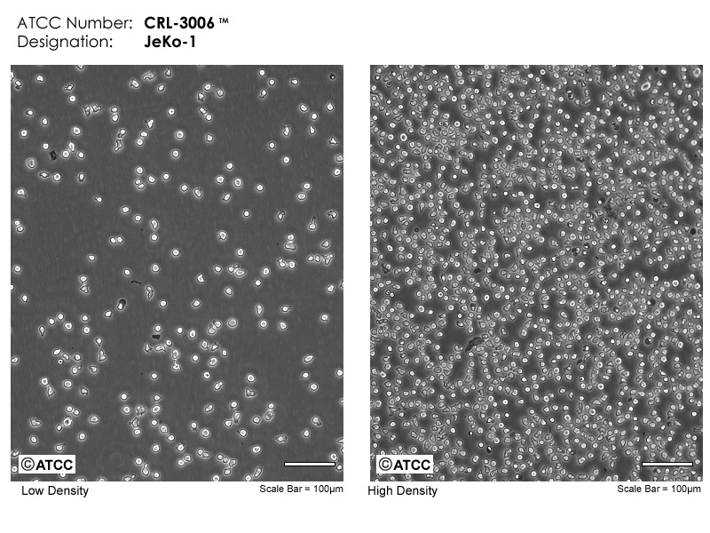 一位套細胞淋巴瘤患者的巨細胞變種顯示白血病轉(zhuǎn)變,從其外周血單核細胞出發(fā)建立了MCL細胞株JeKo-1。JeKo-1細胞EB病毒陰性,并表達一種B細胞表型的IgM。細胞過表達cyclin D1, Bcl-2, c-Myc及Rb蛋白。Bcl-1/J(H)基因重排得到了PCR證實。JeKo-1細胞在SCID小鼠中高成瘤。