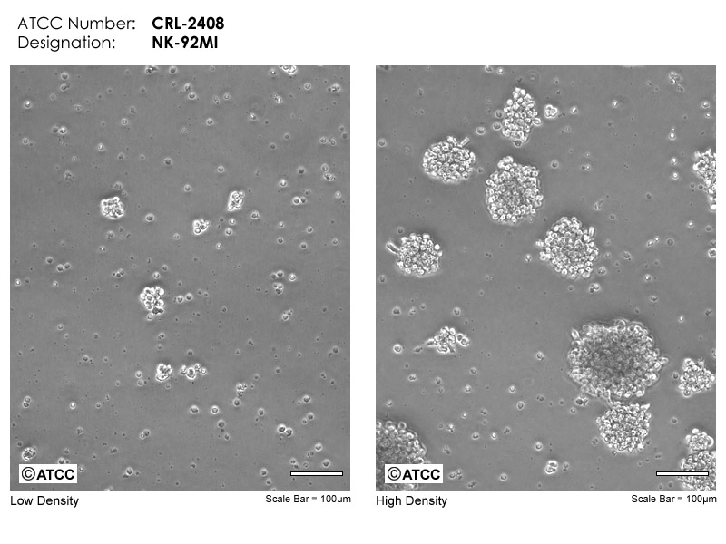 NK-92是從一位患有急進(jìn)性非霍奇金淋巴瘤的50歲白人男性外周血單核細(xì)胞衍生來(lái)的一株白細(xì)胞介素-2依賴(lài)型NK細(xì)胞株。NK-92MI是轉(zhuǎn)染得到的源自NK-92的IL-2非依賴(lài)的NK細(xì)胞株,親本細(xì)胞通過(guò)微粒體基因轉(zhuǎn)化法用逆轉(zhuǎn)錄病毒MFG-hIL-2載體攜帶的人IL-2 cDNA進(jìn)行轉(zhuǎn)化。可能由于載體整合到基因組DNA中,轉(zhuǎn)化是穩(wěn)定的。這株細(xì)胞對(duì)很多惡性細(xì)胞有細(xì)胞毒性;鉻釋放試驗(yàn)顯示它能殺死K562和Daudi細(xì)胞。NK-92細(xì)胞有以下特征:CD2,CD7,CD11a,CD28,CD45,CD54和CD56陽(yáng)性