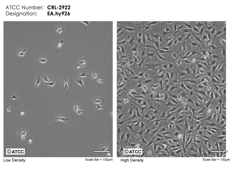 在PEG脅迫下,將原代培養(yǎng)的人臍靜脈細(xì)胞與抗硫鳥嘌呤的A549克隆株融合,構(gòu)建了人臍靜脈細(xì)胞株, EA.hy926。 融合子在HAT培養(yǎng)基上生長并以八因子相關(guān)抗原篩選。 EA.hy926已經(jīng)過100次以上的群體倍增(PDLs)。 電鏡照片顯示W(wǎng)eibel-Palade小體的細(xì)胞質(zhì)分布以及組織特異性的細(xì)胞器,分化的內(nèi)皮細(xì)胞特性如血管生成,體內(nèi)平衡/血栓形成,血壓及炎癥反應(yīng)。