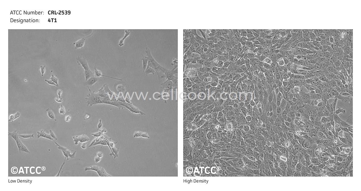 4T1是從410.4瘤株中未經誘變篩得的6-硫鳥嘌呤抗性細胞株。當注射到BALB/c小鼠中時,4T1自發(fā)產生高轉移腫瘤,可轉移到肺,肝,淋巴結和大腦,同時在注射部位形成始發(fā)灶。誘導轉移時不需要摘除始發(fā)灶。4T1細胞在BALB/c小鼠中的生長與轉移特性與人體中的乳腺癌十分相近。這種腫瘤是人VI期乳腺癌的動物模型。4T1誘導的腫瘤在手術后及未手術情況下轉移的動力學相近,可以用作手術后及未手術模型。跟其他腫瘤模型相比,由于4T1的抗6-硫鳥嘌呤特性,微小的轉移細胞團(少到僅僅1個)也可在遠距離組織中檢測出來,比大部分腫瘤模型都更加準確,因為不需要數(shù)結節(jié)數(shù)或者稱量靶標組織重量。
